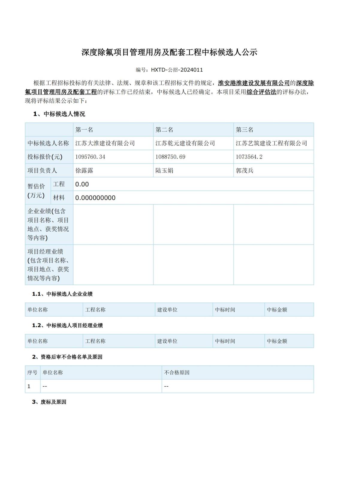 深度除氟項(xiàng)目管理用房及配套工程中標(biāo)候選人公示